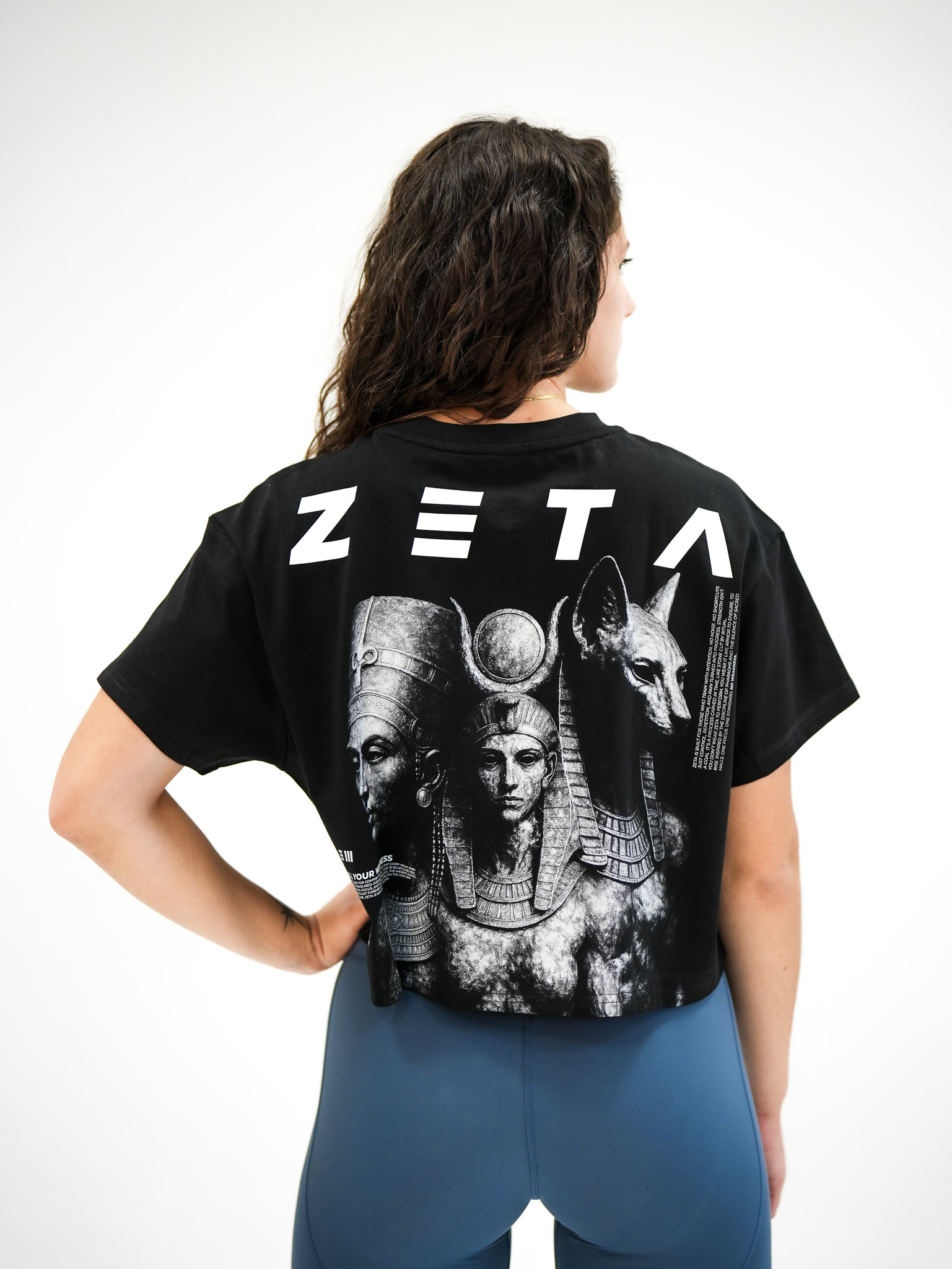 Discover the power of the goddesses with this women’s oversized crop, in a black base, featuring the legendary trio: Bastet, Isis, Nefertiti. Each figure embodies strength, elegance, and determination — a tribute to timeless feminine power.